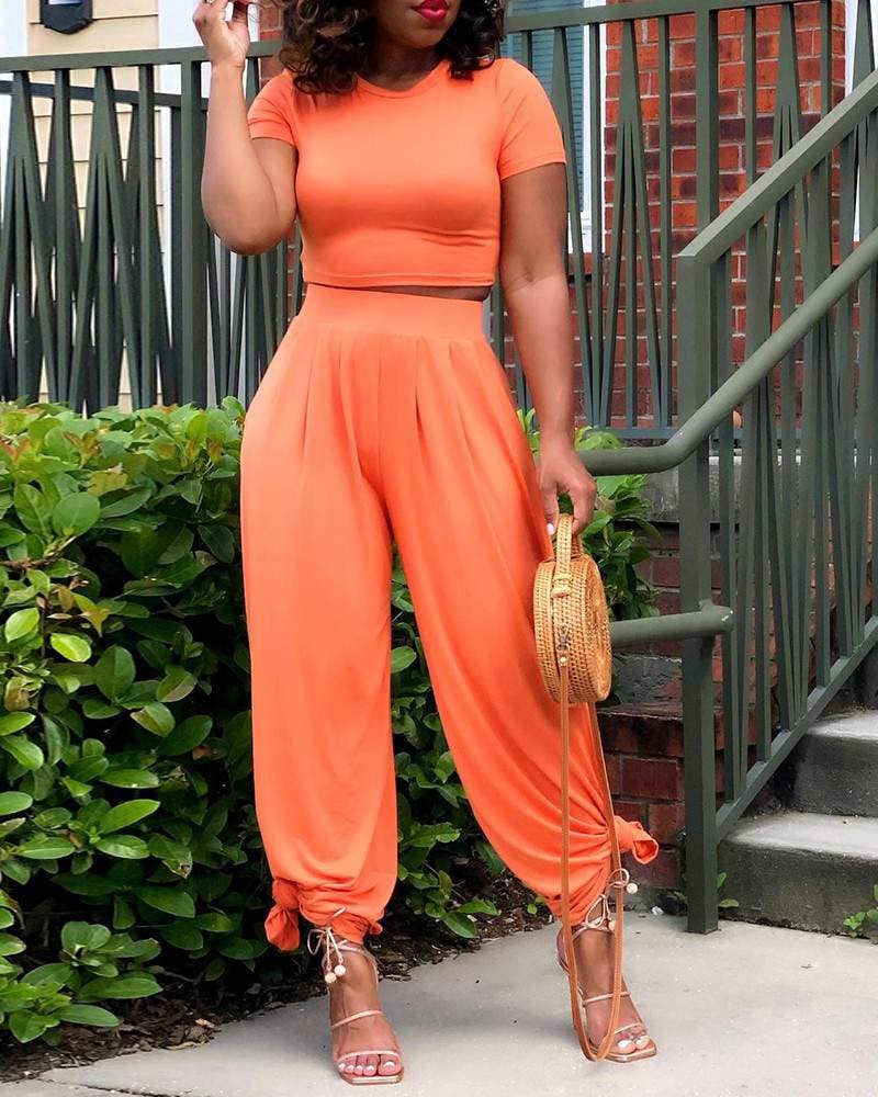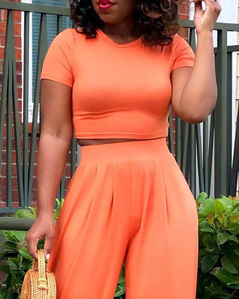 Embrace effortless style with our Crop Top Pants Set. Crafted from luxurious polyester, this set features a plain o-neck crop top and flared pants for a casual yet chic look. The flattering fit and elegant flared leg make it perfect for any occasion. Elevate your daily wardrobe with this must-have set.