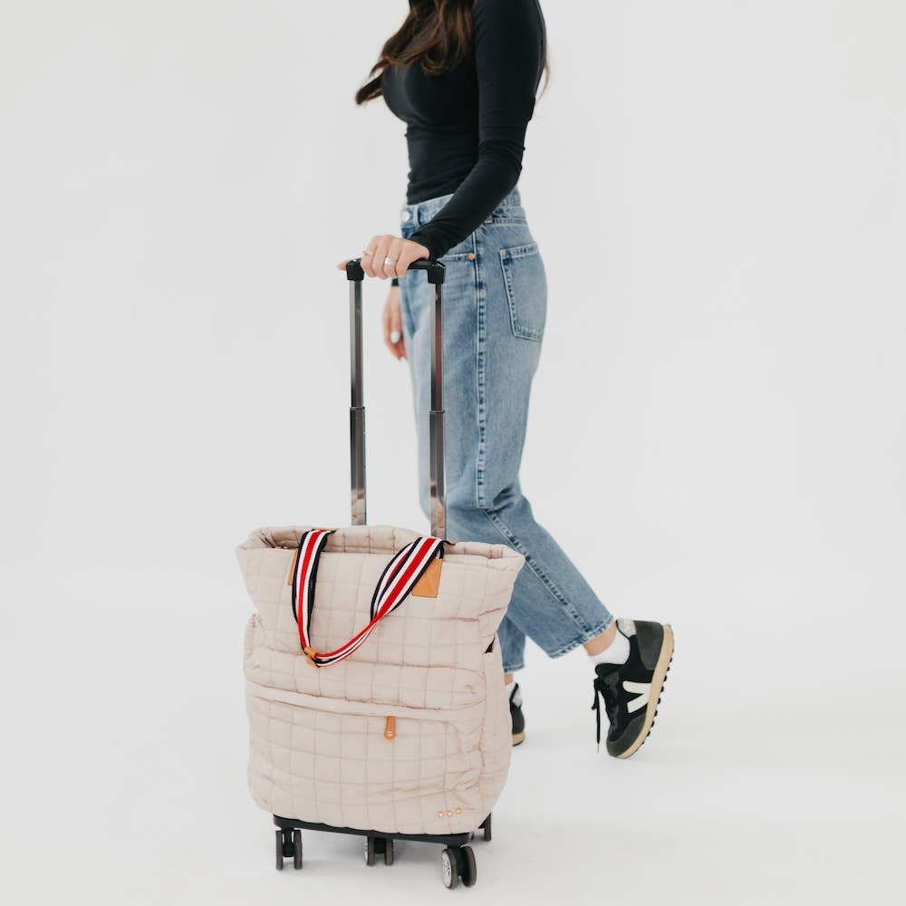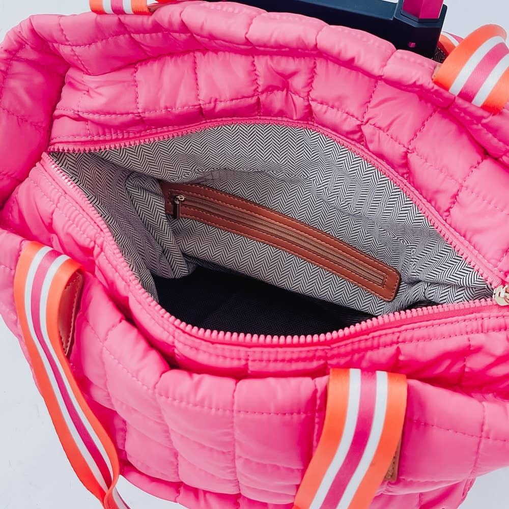 The Tenley Quilted Tote Roller Bag is the perfect accessory for the mover and shaker lifestyle. Featuring a dual handle, quilted puffer nylon tote bag that is stylish and super functional. The bag rests effortlessly on the included handle wheels by a trolly sleeve to easily wheel your bag around. The bag has numerous pockets and compartments, and the trolly includes 5 wheels, making it your new best travel friend! The bag comes in 4 fun colors with coordinating accent handles that make the bag pop!